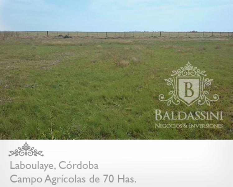 CAMPO AGRÍCOLA DE 70 HAS. PARTE DE UN CONDOMINIO DE 222 HAS. BUENOS RINDES DE SOJA -- CERCA DE LA RUTA 7 - CAMPO SIN SALITRE - SE VENDEN LAS 222 HAS. SE FINANCIA LAS 70 HAS. 70 has en Laboulaye, Córdoba. Sin desperdicios para cultivo. Condominio de 222 has, alambrado perimetral, tranquera de acceso independiente, escrituras independiente perfectas sin deudas. RINDE DE 40 QUINTALES Últimamente no se sembró. Posesión Inmediata LAS COORDENADAS: LATITUD: -34.272849 LONGITUD: -63.109401 Valor: u$s 6500.- Baldassini Negocios & Inversiones - www.baldassini.com.ar - info@baldassini.com.ar - +54 11 40277194