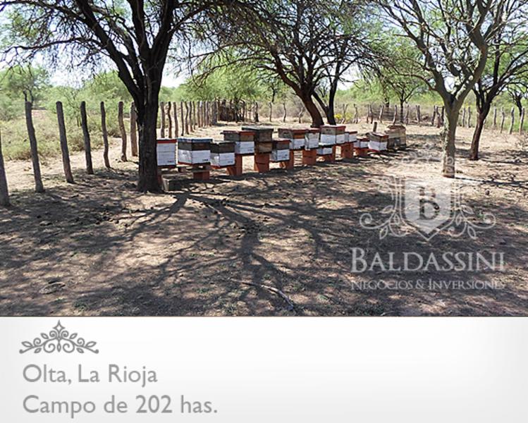 campo de 202 ha. Ubicado en Valdéz de Pacheco, a 20km de la ciudad de Olta, La Rioja con excelentes características ya que posee una parte baja en el centro y loma en las dos puntas. La parte central se riega por manto total cuando desborda el río Olta, permitiendo de esta manera que se encuentre con buen pasto y buena humedad durante todo el año, además de un suelo mucho más fértil por la cantidad de materia orgánica acumulada. En este sector la vegetación característica son chañares, mistoles y algarrobos. Las partes de lomas son con muy leve pendiente hacia el centro del campo, lo cual lo hace apto para cultivos perennes como olivos, membrillos, jojoba, entre otras. La vegetación característica es de quebrachos blancos en su mayoría, algarrobos y cactáceas. MEJORAS: alambrado perimetral en su totalidad, 30 has. aprox desmontadas con renoval joven , pozo de agua de 1 m de ancho encamisado con hormigón hasta los 9 metros, luz eléctrica y agua, construcción de una pieza y baño con paredes hasta el techo. Baldassini Negocios & Inversiones www.baldassini.com.ar - info@baldassini.com.ar - +5411 4024 7194 - +54 11 4244 7561