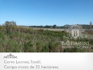 Campo de 52 Hectáreas, en Cerro Leones, Tandil, Pcia. de Buenos Aires, cercano a intersección de Ruta 30 y Ruta 74, a 2 km. del asfalto, 1,5 km. del pueblo y 10 km. de la Ciudad. Es un campo mixto, 32 hectáreas agrícolas, y el resto ganadero. Posee alambrado perimetral, gas a 1 km. y luz en la puerta. Por su ubicación y crecimiento demográfico en Tandil, es también una INVERSIÓN IDEAL para desarrollo urbanístico, country o loteo.
